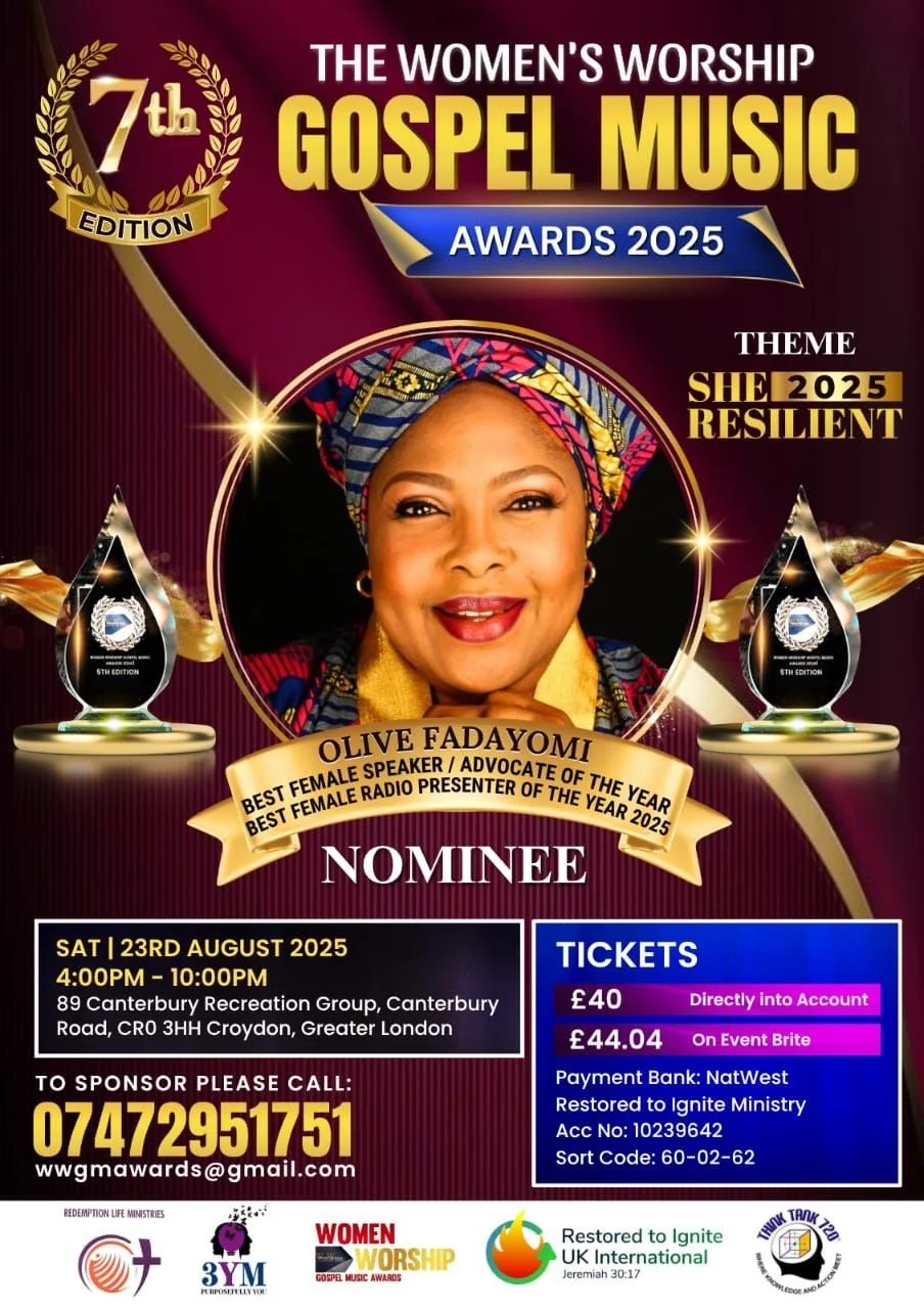 We are delighted to announce that Olive Fadayomi has been nominated for two prestigious awards at the upcoming 7th Edition of the Women’s Worship Gospel Music Awards, taking place on Saturday, 23rd August 2025, in Greater London.